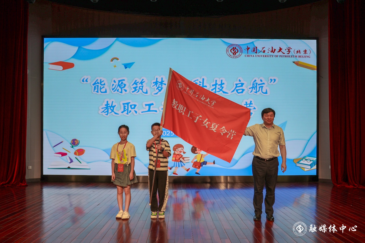 开营仪式上,学校党委副书记、纪委书记韩克飞为夏令营营员授旗。他代表学校对同学们参加夏令营表示欢迎,希望小营员们亲身感受父母工作的环境氛围,切实感悟平凡岗位中的伟大之处,深入了解石油精神和中石大文化,深刻理解建设能源强国的重要意义和高校育人的重要作用。他嘱咐营员们遵守纪律要求,服从带队老师的管理安排,加强学习交流,在活动中收获友谊与成长。