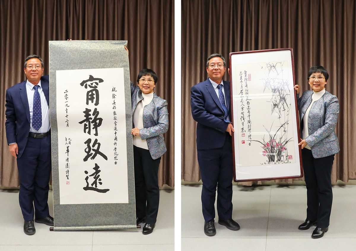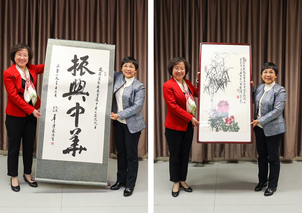 90岁高龄的华泽澎教授和82岁的余世诚教授,得悉三位校友当选院士的喜讯后非常高兴,提笔泼墨为三位院士分别题字作画。山红红向三位院士赠送了书画作品。