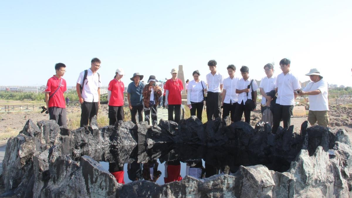实践团走进黑油山,沥青丘旁原油自裂隙渗出后散发出浓烈的硫磺味,实践团得知在1955年地质队员正是据此油苗锁定了克拉玛依一号井位,山脚下还原的“地窝子”,展示出当年工人徒步6公里取油样的艰辛。成员还参观了大油泡雕塑群。不锈钢镜面结构反射天空景象与远处井架炼塔的轮廓,形成工业景观的空间对话。