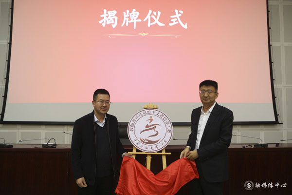 文永红、李海青共同为“青马工程”培训班LOGO揭幕。LOGO设计采用图形与汉字相结合的方式,展现了“人”“马”“青”的意蕴,“手”化用了流动的油滴形状展现学校特色,也蕴含着托起青年成长的希望。