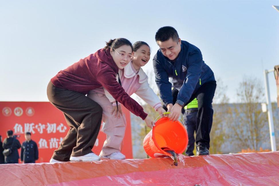参加活动的师生及校友代表在红山湖畔放流区域将5000余尾鱼苗投进水中。一尾尾鱼儿跃入水面,荡开圈圈涟漪,不仅为这片精神地标注入了新的生机,更以“鱼跃人欢”的盛景,象征着中石大精神的蓬勃生机与薪火相传。