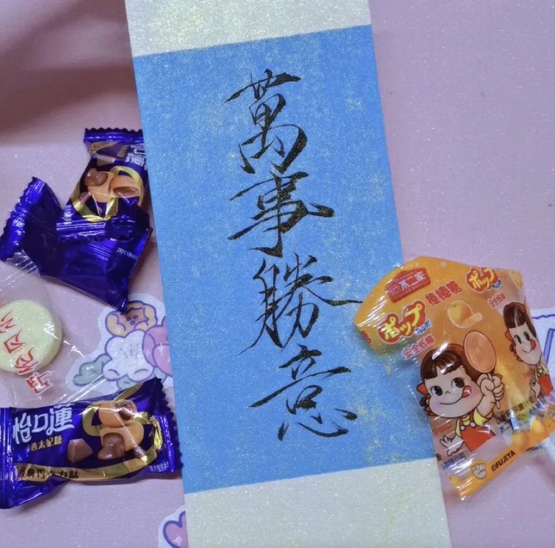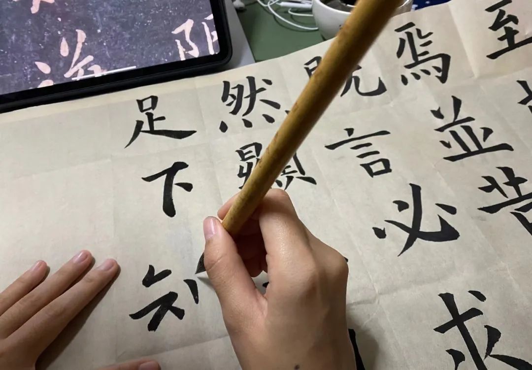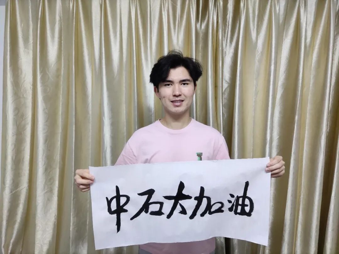 拿出我最喜欢的笔墨纸砚,静心、凝神,思考、沉淀,还有留学生们也用毛笔字为“中石大加油!”