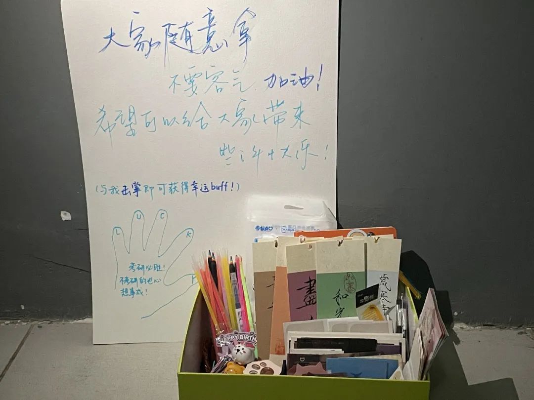这两天润杰公寓2号楼二楼的楼口,同学们被一个方形的盒子吸引。“大家随意拿,不要客气,加油!”“希望可以给大家带来些许快乐!”盒子旁边用彩笔写着这样的提示语,盒子里摆满了漂亮的手绘明信片。