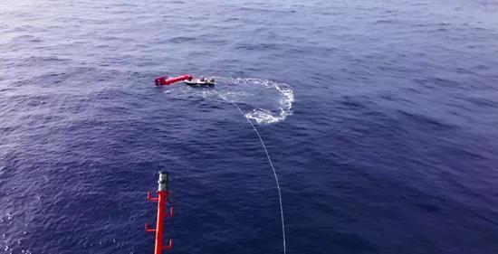 经过8个多小时的水下连续作业,黄昏时分,“深海勇士号”上浮到海面上,通过缆绳吊装,“深海勇士号”载人深潜器稳稳地坐落到“探索二号”母船上,下潜任务圆满完成。