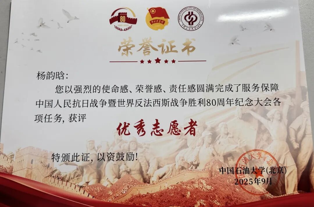 今年,杨韵晗作为志愿者服务保障中国人民抗日战争暨世界反法西斯战争胜利80周年纪念大会。为了圆满完成任务,从每一个引导动作到每一句服务用语,她都反复打磨,始终保持专注与认真。9月3日,正式活动结束时,虽然已经非常疲惫,杨韵晗依然保持微笑向观众挥手道别。