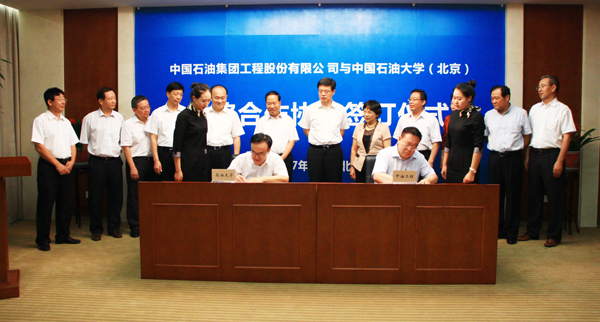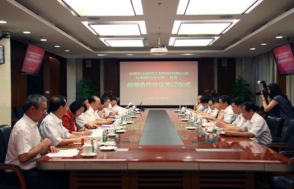 7月31日下午,beat365在线唯一官网与中国石油集团工程股份有限公司及成员企业合作签字仪式在中国寰球工程有限公司举行。中国石油天然气集团公司副总经理覃伟中,中国石油天然气股份有限公司总工程师蔺爱国,中国石油天然气集团公司总经理助理汪世宏,中国石油集团工程股份有限公司总经理白玉光、党委书记赵玉建,中国石油管道局工程有限公司总经理丁建林,中国石油工程建设有限公司党委书记、工会主席宋德琦,中国寰球工程有限公司总经理王新革、党委书记李利民、副总经理张来勇,中国昆仑工程有限公司党委书记、工会主席沈钢;beat365在线唯一官网党委书记山红红、校长张来斌、副校长徐春明等校企双方领导出席了签约仪式。