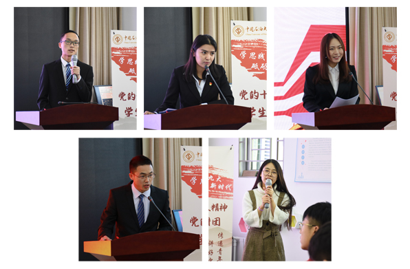 “我来自全国连片特困区之一的贵州省乌蒙山区,十八大以来,在党中央带领下,大力扶贫攻坚,整个乌蒙山贫困区发生了巨大的变化,宽敞的水泥路基本上实现了村村全覆盖。”学生宣讲团团长、石油工程学院2017级研究生王财忠以“初心和使命”为题,结合自己家乡的变化,阐述了对中国共产党的初心和使命的理解。理学院2015级本科生、少数民族学生骨干艾克但•艾合买提以“各族人民齐心共赴新时代”为题,分享了自己作为新疆教育惠民政策的受益者对党和国家的感恩之情,她呼吁少数民族大学生用实际行动为石油梦、新疆梦、中国梦努力奋斗,各民族团结一心共赴新时代。地球科学学院2016级研究生、辅导员牟琪琪以“不忘初心,勇担青春使命”为题,表达了与祖国同成长、共奋进的青春感受,讲述了新时代青年的历史使命,特别是作为一名辅导员的信心与力量、责任与担当、光荣与梦想。科学技术研究院2016级研究生王文昌结合自己服役于武警8652部队装甲连两年的经历,讲述了对“强国梦,强军梦”的深刻理解,诉说了携笔从戎、保家卫国的远大志向。马克思主义学院2017级研究生张洁以“和中国梦,一起走在通往梦想的路上”为题,分享了对于如何把个人梦想融入国家梦想的认识和体会。