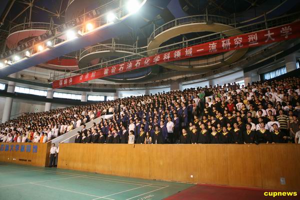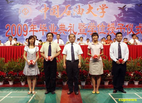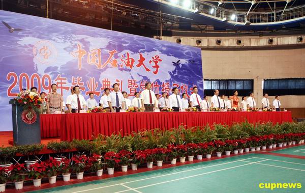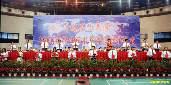 6月29日上午,我校在多功能厅隆重举行2009年毕业典礼暨学位授予仪式。校友代表、冀东油田总经理助理刘占军,校领导蒋庆哲、张来斌、吴小林、刚文哲、雷玉江、陈大恩、徐春明、庞雄奇、张士诚,以及各院(系、部、中心)和各二级部门主要负责人出席了典礼并在主席台就座。毕业典礼由校党委副书记雷玉江主持。