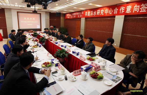 张来斌校长对姜锡肇总裁一行的到来表示热烈欢迎,对公司取得的骄人业绩表示钦佩。他简要介绍了我校的办学历程、办学思想、办学条件以及学校在科研教学上取得的成果。张校长表示,海洋一直是学校着力拓展的重要领域,此次双方的合作必将大大提升我校在海洋工程领域尤其是深水领域的科研实力。