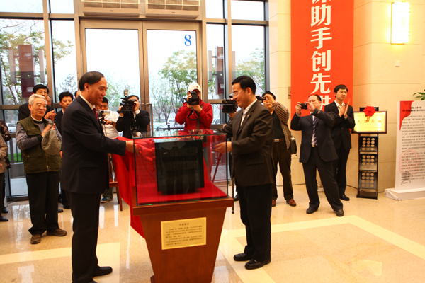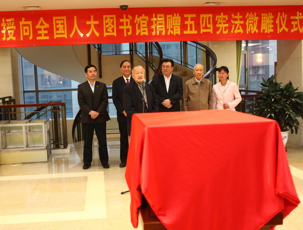 4月20日下午,beat365在线唯一官网退休教师王修斋教授向全国人大图书馆无偿捐赠五四宪法微雕仪式在全国人大图书馆隆重举行。随着全国人大常委会副秘书长张少琴和beat365在线唯一官网党委书记蒋庆哲共同将红绸徐徐揭起,这方全文微雕了中华人民共和国第一部宪法的巨制佳作,正式由全国人大图书馆收藏,并被安放在图书馆大厅中央。