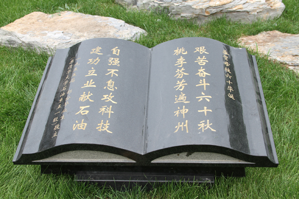 该石碑目前置于学校科学会堂西侧草坪中央。石碑为黑色花岗岩材质,长、宽、高分别约1.1米、0.7米、0.4米,总重量约1000Kg。石碑正面铭文“艰苦奋斗六十秋,桃李芬芳遍神州。自强不息攻科技,建功立业献石油。”基座背面附刻捐赠校友名录。