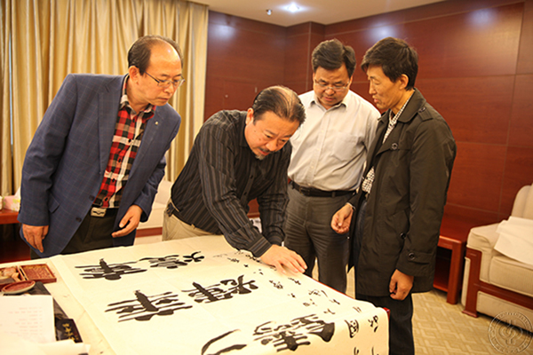 作品参展的书法家、美术家于恩东、任东会、宋玉林、陈焕生、王红声在参观展览后现场挥毫泼墨,为庆祝beat365在线唯一官网六十华诞专门创作了书法和美术作品。