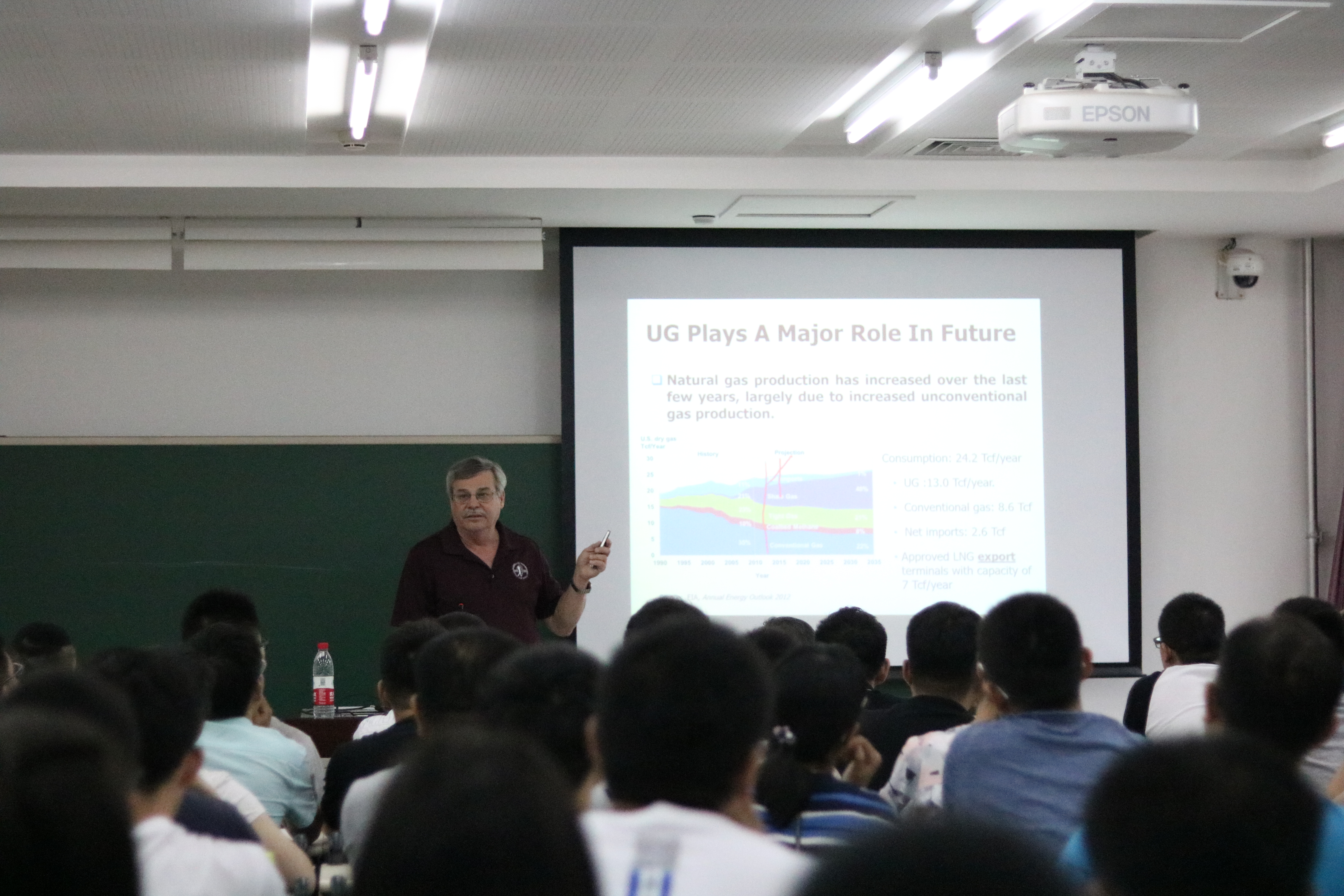 在学术报告中,Daniel Hill教授展开了以“能源革命:美国非常规油气生产”为主题的学术报告,他介绍了美国以及全世界页岩气的储量以及生产开发的情况,他提出,美国近几年天然气产量的大幅增加要归功于页岩气的开采,并介绍了相关的钻井与水力压裂的技术。Nubuo Morita教授以“井壁坍塌预测理论对比分析”为主题展开报告,通过实验结果展示与理论推导介绍了相关的模型和理论,并提出了未来值得研究的问题。Ding Zhu教授开展了TAMU石油工程系研究生招生与录取情况介绍的报告,介绍了面试相关的注意事项,各个老师的专业和研究领域。在提问环节中,同学们十分积极,提出了包括技术上、学校申请上的相关问题,教授们一一作了解答。