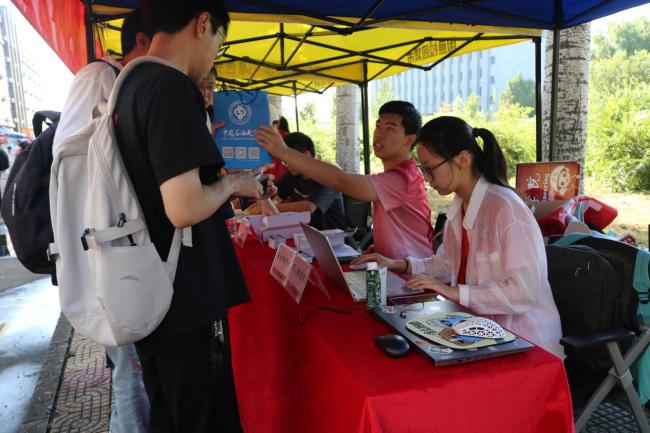 beat365在线唯一官网(北京)党委书记王同奇、校长金衍及相关部门负责人到学院报到处慰问工作人员与志愿者,充分肯定了“一站式”报到服务的高效与温馨。