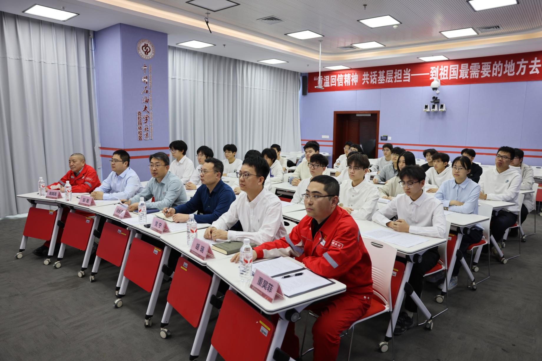 董昊菲结合自己从地质技术岗到共青团工作岗再到宣传文化岗三次转岗的经历,分享了成长感悟。他回忆了在百口泉采油厂与地质图件、岩芯样本为伴的岁月,讲述了转岗后组织青年突击队风雪保产、打造“青”字号品牌、传播石油精神的故事,鼓励学弟学妹们在祖国需要的岗位上发光发热。陈其亮分享了扎根戈壁油田三十载的奋斗历程,从初入荒原的迷茫到深耕一线的坚定,他用“安下心、扎下根、不出油、不死心”的精神,生动诠释了“基层是技术应用的前沿、创新创效的沃土”,勉励学子们把个人理想追求融入党和国家事业之中,在戈壁荒原的淬炼中磨砺意志,在能源报国的实践里彰显价值。
