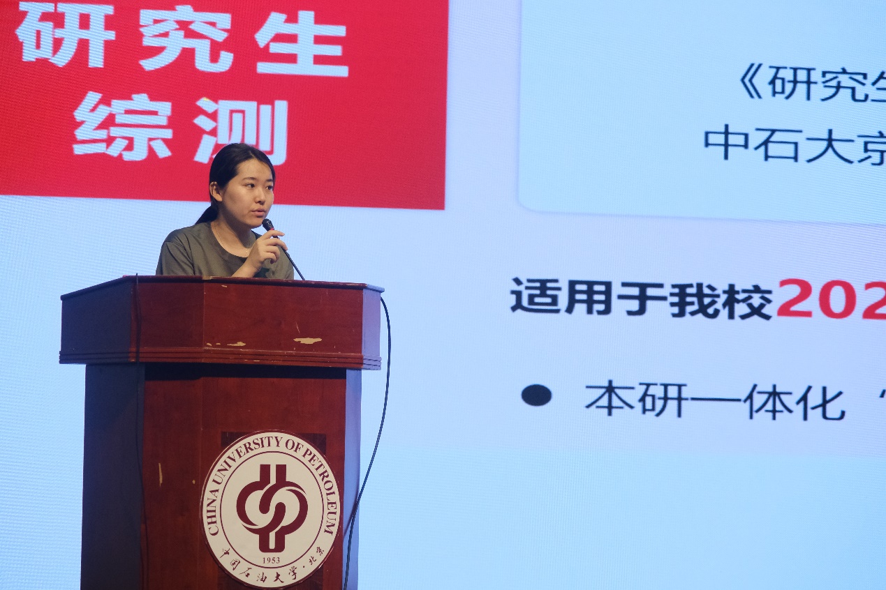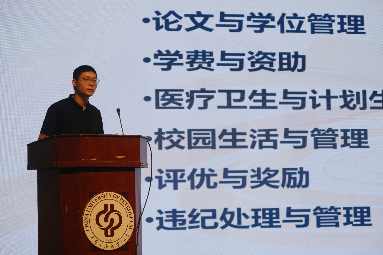 刘东东向新入学的全体研究生表示祝贺和欢迎,并以“能源报国、能源强国”为主题,为新生厘清了石油工程人才的成长范式,从历史沿革、学科建设、科研攻关、人才培养四个方面为新生建立“石工第一印象”,并详细解读了中国石油工程设计大赛、铁人精神训练营、领航团校2.0等学院特色活动,以数据图表的形式直观展示了研究生就业去向以及招聘单位的能力需求,并鼓励新生成为石油工程学院的明日之子。