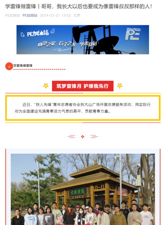 三月春风暖人心,雷锋精神永传承。为深入学习贯彻习近平总书记关于弘扬雷锋精神的重要论述,进一步弘扬“奉献、友爱、互助、进步”的志愿服务精神,推进雷锋精神在广大学生中蔚然成风,石油工程学院开展了“弘扬雷锋精神 绽放青春风采”学习雷锋月系列活动。