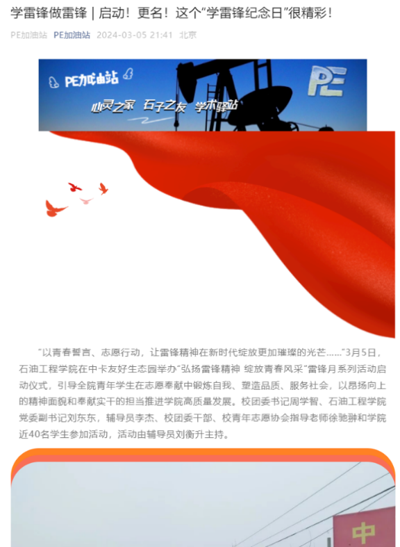 “启动、宣讲、观影、支教、开辟专栏”丰富多彩的活动,掀起全院追“锋”热潮,引导广大学生投身志愿服务,爱心奉献社会。以“雷锋纪念日”为契机,学院举办学习雷锋月系列活动启动仪式,邀请全国三八红旗手李淑芳为学生讲述带领周边妇女一起勤劳致富的故事,激发广大学子爱岗敬业、奋勇争先的工作热情。组织志愿者通过猜灯谜、唱红歌等喜闻乐见的形式打造“小小雷锋课”,为昌平雪绒花社区孩子们的心里播下“雷锋精神”的种子。采油采气工艺党支部、石工22-2团支部、石工22-1班等党团班多形式观看雷锋事迹专题片、宣讲新时代雷锋故事,共同深刻领悟雷锋精神的历史意义与当代价值。学院开辟“学雷锋做雷锋”宣传专栏,持续报道典型事迹、品牌活动等推文21篇,阅读总量超8000人次,积极营造学院“人人学雷锋,处处有雷锋”良好氛围。