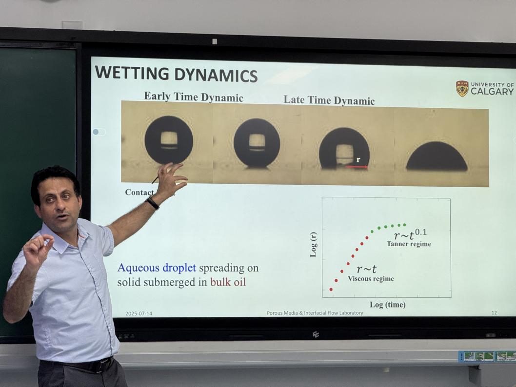 Firoozabadi教授系统阐释了体相与界面热力学及其在地下流体流动与热能开采中的应用理论体系。首日课程聚焦热力学基础与相态演化,Firoozabadi教授通过严谨的公式推导,结合《油气藏热力学》教材和相关学术论文,解析重力场与毛细管力场耦合作用下的三相平衡机制。次日课程深入工程实践核心,Firoozabadi教授以状态方程为例,强调闪蒸计算在碳封存设计中的关键作用,并同步关联教材内容强化理解。第三日课程转向学科前沿,Firoozabadi教授通过相场法动态模型展示裂缝扩展机理,揭示界面张力与线张力对压裂液行为的控制规律。Hossein Hejazi教授的压轴报告呈现了重油开采技术突破,通过高温高压微观实验影像,直观展示高温乳化剂诱导的原位油包水乳液在岩石孔隙中的流动特性,结合界面流变学数据定量解析剪切应力对液滴断裂的调控机制,为重油开采提供了全新解决方案。课程间隙,聆听课程的同学和老师与Firoozabadi教授、Hossein Hejazi教授深入交流探讨,启发新的研究思路。