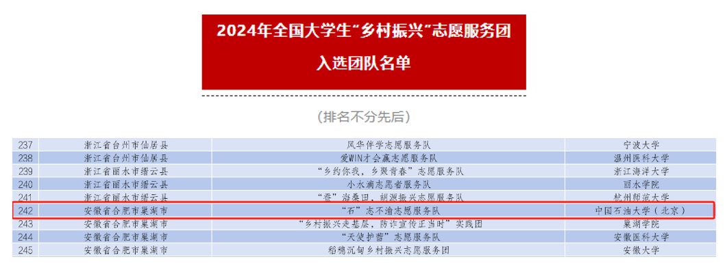近日,中国青年志愿者公布了2024年全国大学生“乡村振兴”志愿服务团入选名单,beat365在线唯一官网(北京)石油工程学院“石”志不渝志愿服务队成功入选。这也是该团队第二次入选团中央“乡村振兴”志愿服务专项,并获得团中央2023年全国大学生“乡村振兴”优秀团队(全国100支)。