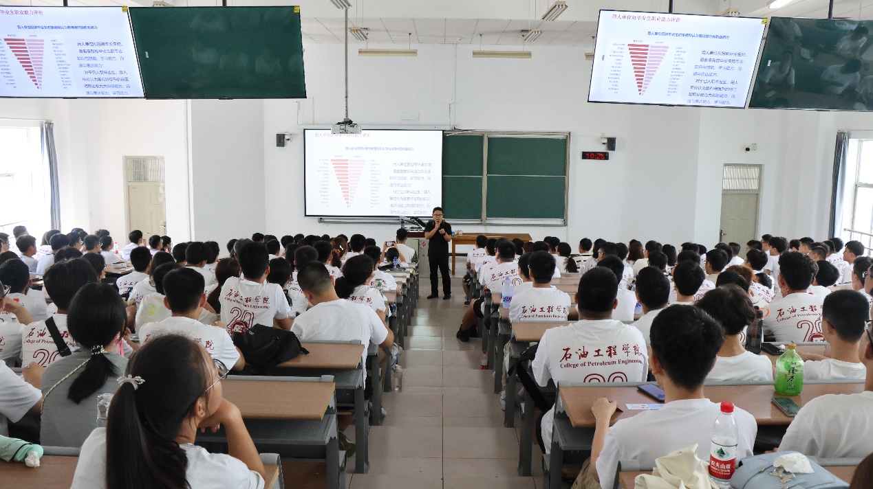 在本科入学教育第二讲中,李世远侧重于日常教学与培养方面,对我院历史沿革、石油工程专业培养情况,近年来专业培养改革及绿色智能转型探索展开详细的解读,并着重介绍了石油工程学院的创新培养模式与绿色智能课程体系。最后他鼓励同学们利用大学关键阶段,夯实专业基础,开辟精彩人生,实现远大理想。