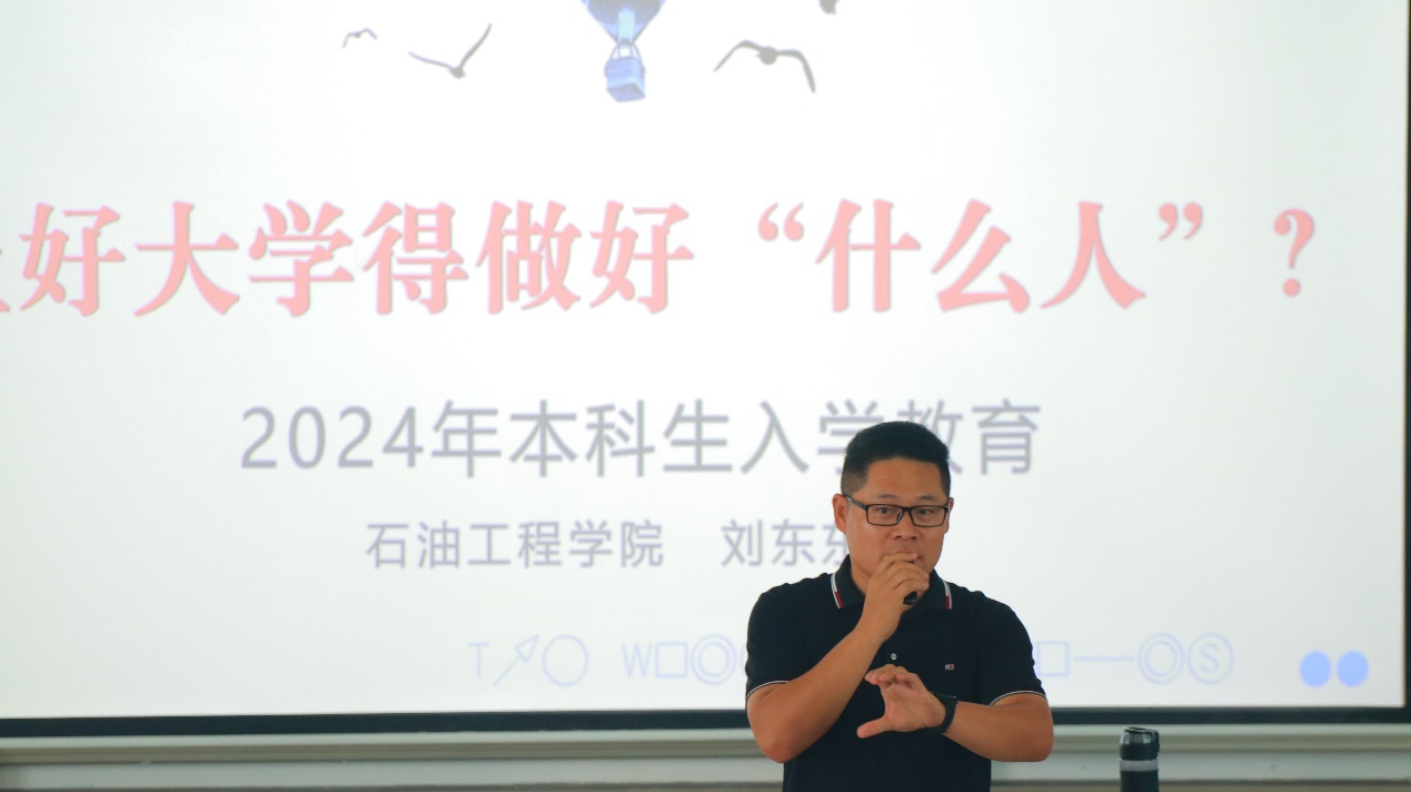 在本科入学第一讲中,刘东东侧重于日常教育与管理方面,以“上好大学得做好什么人”为题,就学院基本概况、综合测评办法、违纪处理、生涯规划和文明礼貌等方面进行了耐心细致的讲解。他希望同学们尽快做好大学四年的规划,尽快适应身份的转变,在保证学习成绩的同时注重全面发展,做能担重任、可堪大用的社会主义接班人。
