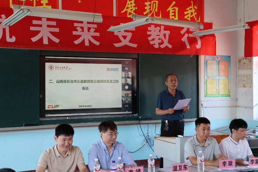 温卫东代表县教育局热烈欢迎实践团老师同学的到来,并希望他们可以真正的走入沁县、了解沁县,服务沁县,宣传沁县,在本次的“支教行”中培养“支教情”。他表示此次活动是沁县优化整合教育资源、大力促进城乡教育融合发展的重要举措,后续县教育局将认真指导服务此次夏令营活动,并期盼未来有更多志愿者来到沁县,为沁县教育改革发展贡献青春力量。