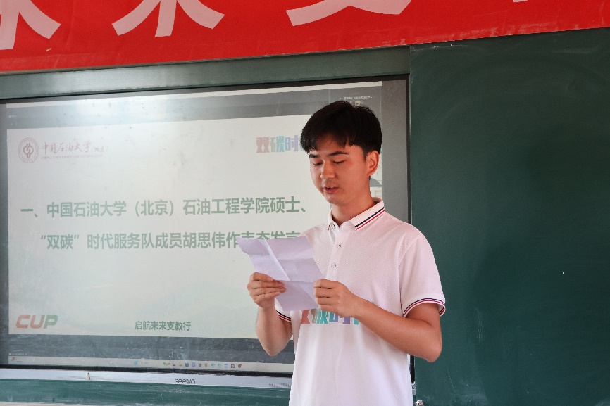 “双碳”时代服务队成员胡思伟作为成员代表作表态发言,表示将会以双重身份投入到夏令营活动中,既做播撒知识种子的老师,又做走近学生内心世界的朋友,希望通过此次活动将“红色精神”“传统文化”“能源报国”的种子播撒在学生们的心间,用实际行动展现新时代能源学子的责任担当。