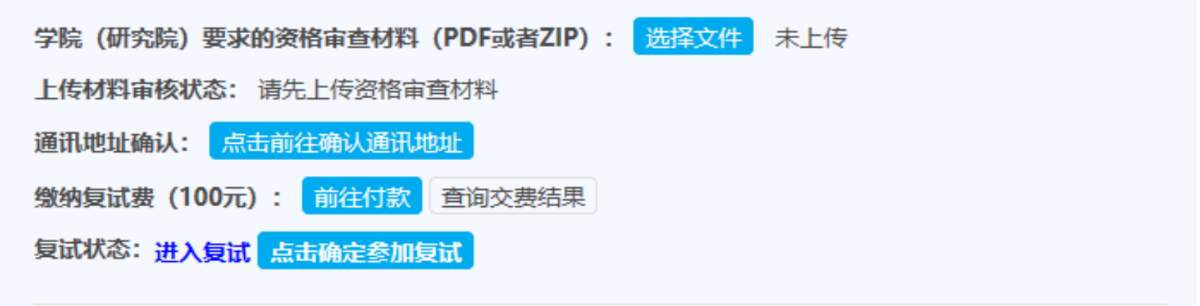 所有进入复试的考生均须在学院规定的时间内,通过我校研究生招生管理信息系统(http://gmss.cup.edu.cn/logon)选择“硕士研究生复试录取”栏目完成“复试确认(资格审查材料上传、缴费)”、“意向导师选择”。