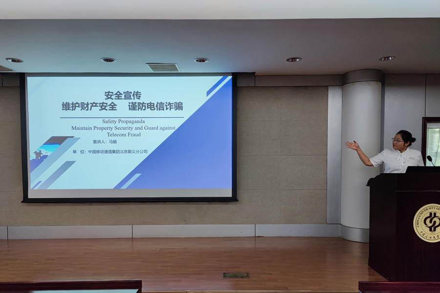 To effectively improve the safety awareness of international students of China University of Petroleum (Beijing) against telecommunications fraud and avoid the loss of international students’ property, China University of Petroleum (Beijing) College of International Education specially invited Ma Yue, the safety publicity specialist of China Mobile Communications Group, Beijing Shunyi Branch Come to the school to carry out a safety knowledge lecture on " Maintain Property Security and Guard against Telecom Fraud".