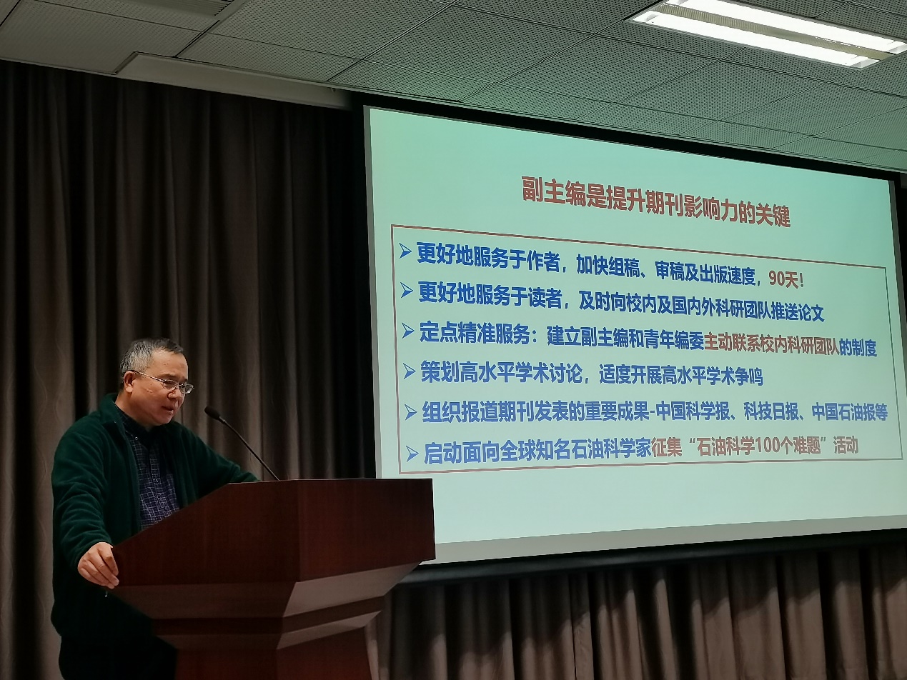 会上,张来斌为新聘任的校内副主编颁发了聘书。肖立志做了关于期刊弱势分析以及如何进一步提升期刊影响力的报告。肖立志在报告中指出,《Petroleum Science》入选国家领军期刊以来,在中国科协的指导督导下,遵循国际一流期刊办刊标准和规范要求,稳步推进各项工作,但依然存在审稿和出版周期长、影响力和宣传推广力度不足、国内外高水平论文不多、国际影响力与对标期刊差距较大等问题。肖立志强调,副主编和青年编委以及编辑部要更好地服务于作者和读者,加快组稿、审稿和出版速度,及时向校内及国内外科研团队推送论文,建立副主编和青年编委主动联系校内科研团队的制度,并策划高水平学术讨论,开展高水平学术争鸣,组织报道期刊发表的重要成果,进一步提升期刊影响力。
