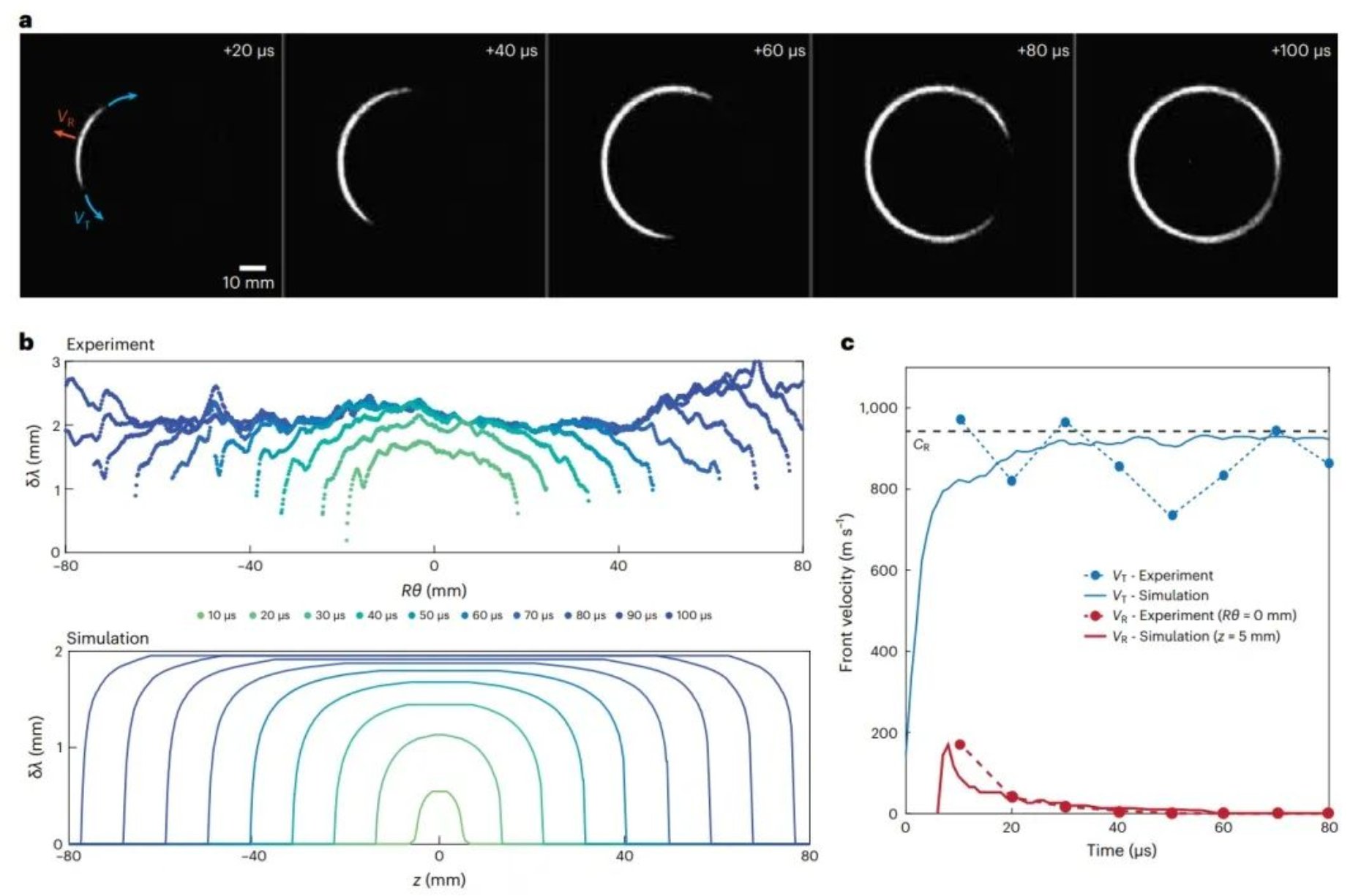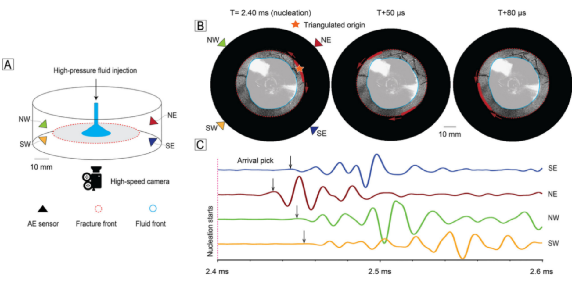 为了理解三维空间中的断裂,该团队设计了独特的实验装置和实验流程,在透明材料中造出裂缝,然后注入不同粘度的液体,使用每秒可以捕获100000张图像、空间分辨率为数微米的高速相机,通过先进的声发射传感器,能够可视化并听到裂缝在材料中传播时的动态过程。研究发现,裂缝并不像连续波那样在材料中移动,而是走走停停,从起源向外通过一系列高速跳跃传播。