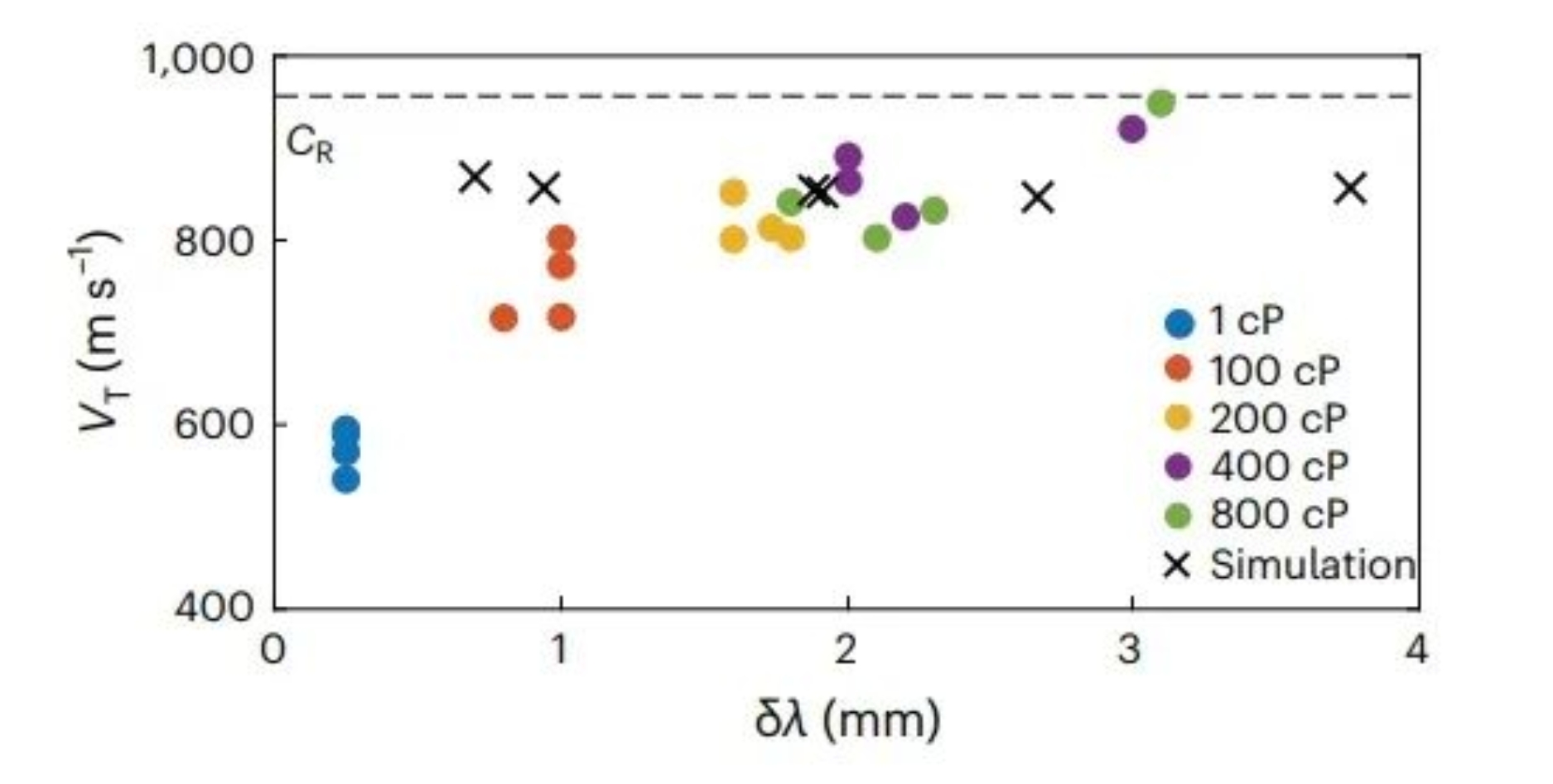 Cochard说:“这是一个非常动态的过程。新裂缝在断裂停滞前沿线的某个地方形成,局部扭曲,导致裂缝以声速在断裂线方向上扩展,然后液体跟进。裂缝停止,夜体渗透,引起断裂前沿应变,新的裂缝再次开始遵循相同的动力学过程。”各种流体粘度下水力压裂实验的原始图像,每秒捕获100000帧。内环和外环分别对应于液体及断裂前沿的位置。通过视频,可以看到裂缝前沿呈现出停止和前进的抖动运动。振幅和时间随流体粘度而变化。研究发现,这些跳跃之间的振幅和时间取决于液体的粘度。对于低粘度液体(如水),跳跃之间的时间很短,因为流体几乎瞬间就渗透到裂缝中。对于高粘度液体(如甘油,其粘度类似于蜂蜜),所谓的断裂前沿(裂缝所在的位置)和流体前沿(液体尖端所在的位置)之间的滞后时间会增加,因为高粘度流体需要更长的时间才能渗透到裂缝中并将其扩展。