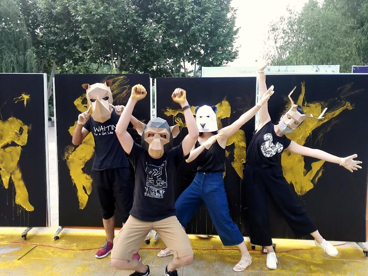 在这个原本平静的下午,掀起了一场涂鸦与音乐的狂欢。两个社团的同学都身着一袭黑衣带着立体的动物面具,个性张扬的造型吸引了很多观众,让人眼前一亮。