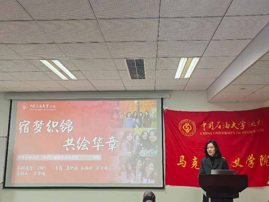 万子晗以“宿梦织锦,共绘华章”为主题,介绍了本宿舍在校园生活实践中全面发展取得的优异成果。