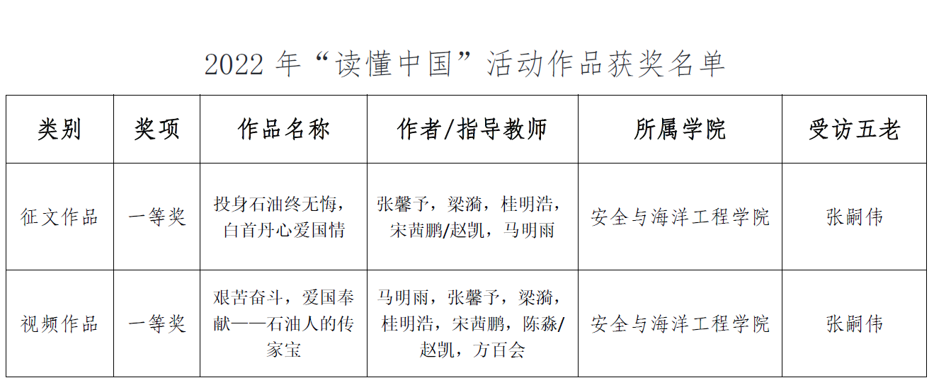 近日,beat365在线唯一官网(北京)关心下一代工作委员会公布了2022年“读懂中国”活动评审结果,安全学院报送的采访张嗣伟教授两份作品:征文《投身石油终无悔,白首丹心爱国情》、微视频《艰苦奋斗,爱国奉献——石油人的传家宝》均获校级一等奖。
