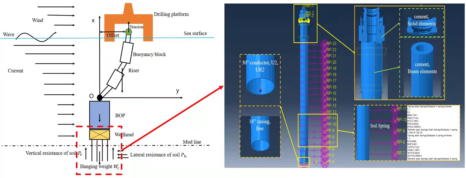 水下井口在钻完井工况下的受力极为复杂,隔水管在风浪流的耦合作用下会对水下井口造成巨大的弯矩、剪切力等疲劳载荷,同时还承受着井内压力、防喷器、悬挂管柱以及采油树的重量等,极易产生疲劳失效的风险,其中高压井口头与套管连接处的高压焊缝更是疲劳频发的热点区域,一旦井口发生疲劳失效将导致井喷等重大安全事故,计算难度大,目前国内针对浅水水下井口疲劳寿命的研究仍处于起步阶段。深海工程研究团队针对水下井口焊缝疲劳中的载荷谱、土壤非线性、焊缝疲劳曲线、应力集中系数等难点与关键问题,根据DNV的相关技术规范,全面考虑环境、井口弯矩、剪切力、套管重量等疲劳载荷,渤海油田土壤参数,以及水泥返高等影响因素,历经10个月的科研攻关,形成了钻完井工况下水下井口高压焊缝的疲劳寿命计算方法,首次解决了国内水下高压井口焊缝疲劳寿命预测难度大、精度低的技术难题,计算结果顺利通过了挪威船级社的国际权威认证,为我国首套浅水水下井口的安全高效钻井提供了理论和技术支撑,未来在渤海浅水水下井口中具有广阔的推广前景。