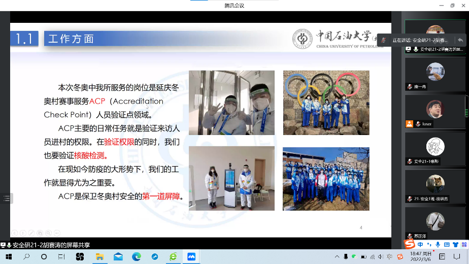 胡赛涛主要为同学们介绍了自己在工作和生活方面的所见所闻,他表示ACP是保卫冬奥村安全的第一道屏障,在疫情防控的关键时期,自己的工作显得尤为重要,同时要感谢每一片激情燃烧的“雪花”,因为他们,才有这盛世美景!