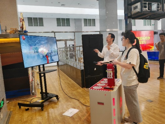 同时,为提高新生们的安全防范意识,朱益指导大家进行了3D消防模拟演练。新生们按照“一提、二拔、三握、四压”的口诀熟悉灭火器的使用过程,在实际操作中锤炼消防技能。