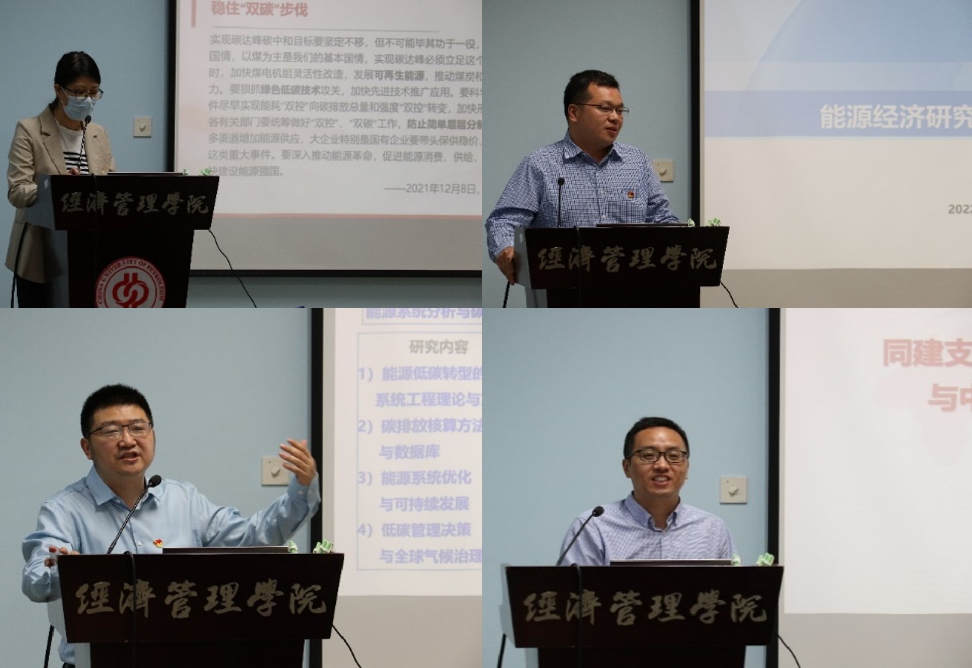 本次主题党日活动主要包含四方面内容,即同学一次党课、同奔一个目标、同做一项研究、同建一个堡垒。经管院管理科学与工程系教工党支部委员林绿以“同学一次党课”为主题,分享学习习近平总书记关于双碳的重要论述心得体会。能经院综合管理部党支部书记丛威以“同奔一个目标”为主题,对能经院相关研究和工作情况进行了介绍,阐释能经院综合管理部党支部与经管院管理科学与工程系教工党支部的协作共建的意义与价值。经管院院长、人事处处长唐旭以“同做一项研究”为主题,介绍了学院现阶段油气“双碳”领域开展的主要科研工作及科研成果,表示党支部共建将为能经院和经管院搭建更好的合作桥梁。经管院管理科学与工程系教工党支部书记王建良以“同建一个堡垒”为主题,阐释了四方支部共建合作的意义和未来支部共建思路。围绕共建形式、双碳合作、人才培养、学生就业等话题,与会人员展开讨论,纷纷表示支部共建工作将对于提升共建支部党员理论素养、促进科研合作和成果转化等方面具有积极作用。