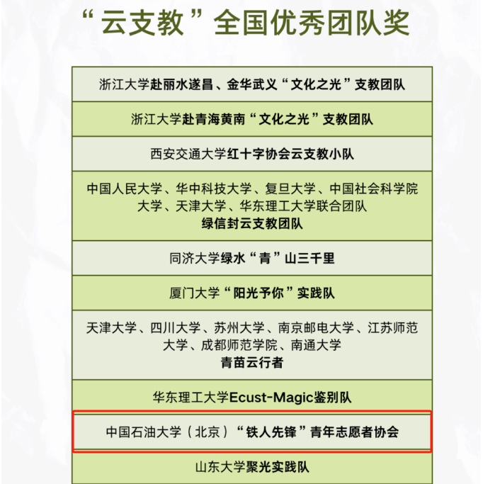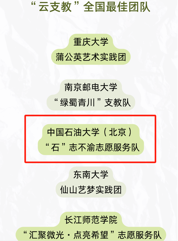 近日,由中国知行计划和团中央“美丽中国·青春行动”倡导开展的“美丽中国·青春行动”第六届云支教乡村教育奖成果公布,石油工程学院“石”志不渝志愿服务队获评“云支教”全国最佳团队(全国5支),“铁人先锋”青年志愿者协会获评“云支教”全国优秀团队(全国35支)。