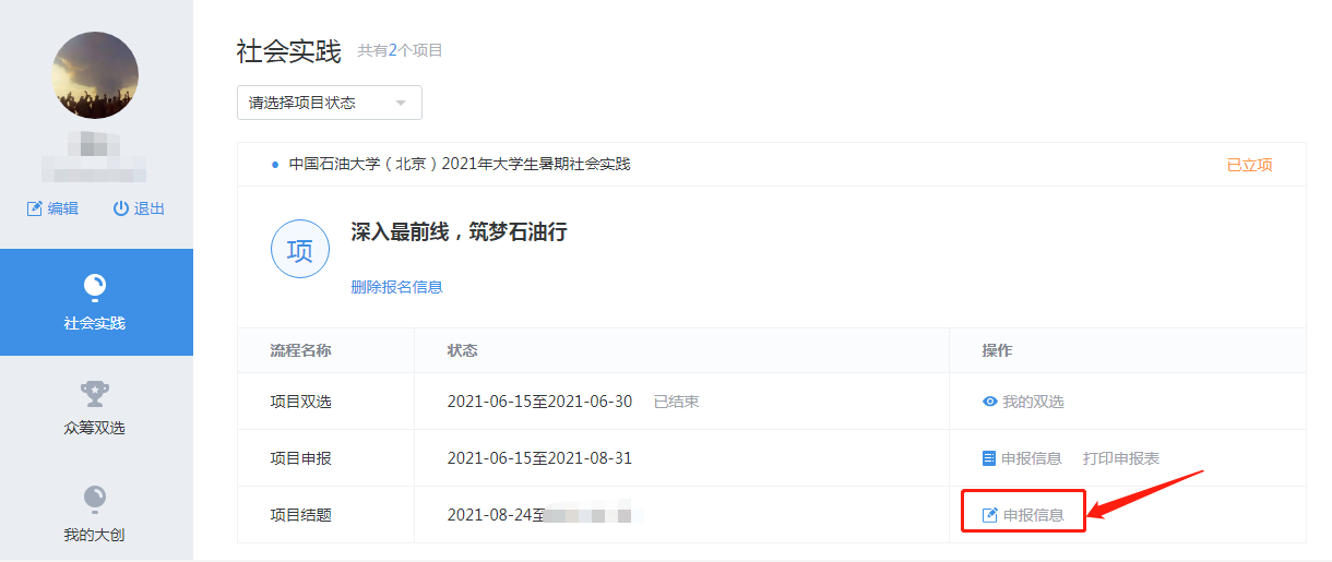 实践成果包括实践总结、调研报告或论文、访谈记录、观察报告或工作报告、照片、视频等资料。所有实践团队按要求认真整理总结实践成果(具体要求见《附件1:实践成果收集说明》),由队长从电脑端登录https://sct.cup.edu.cn/,到个人中心项目结题-申报信息处填报。