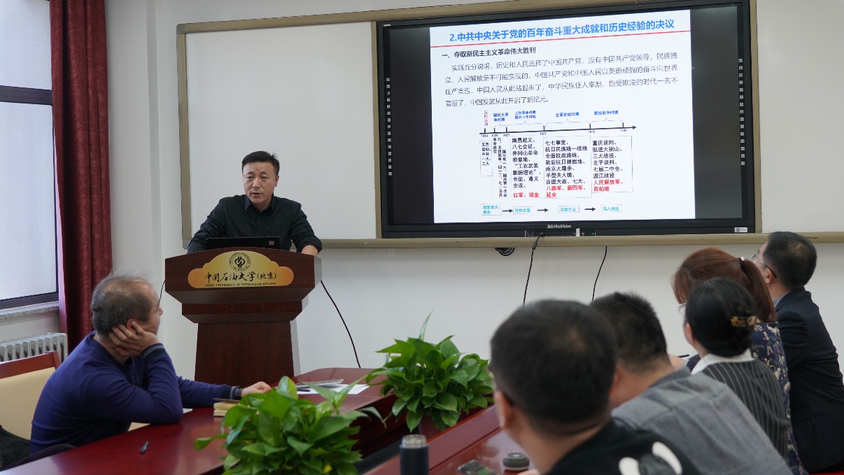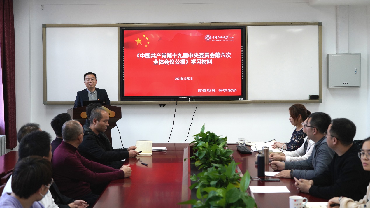首先,网络与继续教育学院第一党支部书记董刚同志导读《中共十九届六中全会公报》。董刚同志详细介绍了六中全会的意义,公报内容、中央号召等问题,提醒党员同志们一定要牢记:中国共产党是什么?要干什么?这一重要初心使命。然后,石工学院油气田开发第一党支部书记赵晓亮同志对《中共中央关于党的百年奋斗重大成就和历史经验的决议》进行导读,再次带领大家回顾了党的百年奋斗重大成就与经验。
