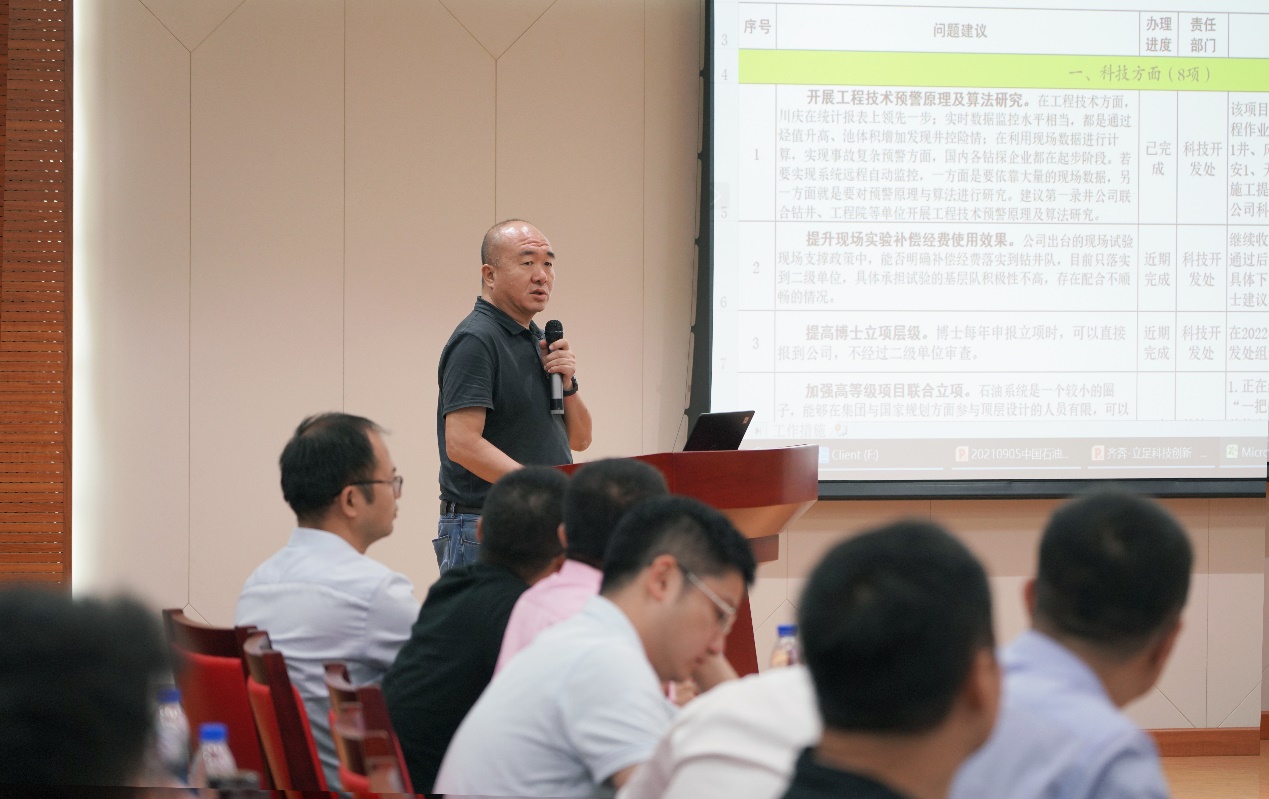 中国石油渤海钻探公司人事处(党委组织部)李峰副处长进行了上期博士沙龙活动相关建议的落实情况通报,针对上一期博士沙龙活动中博士提出的28项建议的落实情况进行了逐一说明,并对其中13项公司已解决问题予以了答复,通报了其中15项待解决问题的建议。