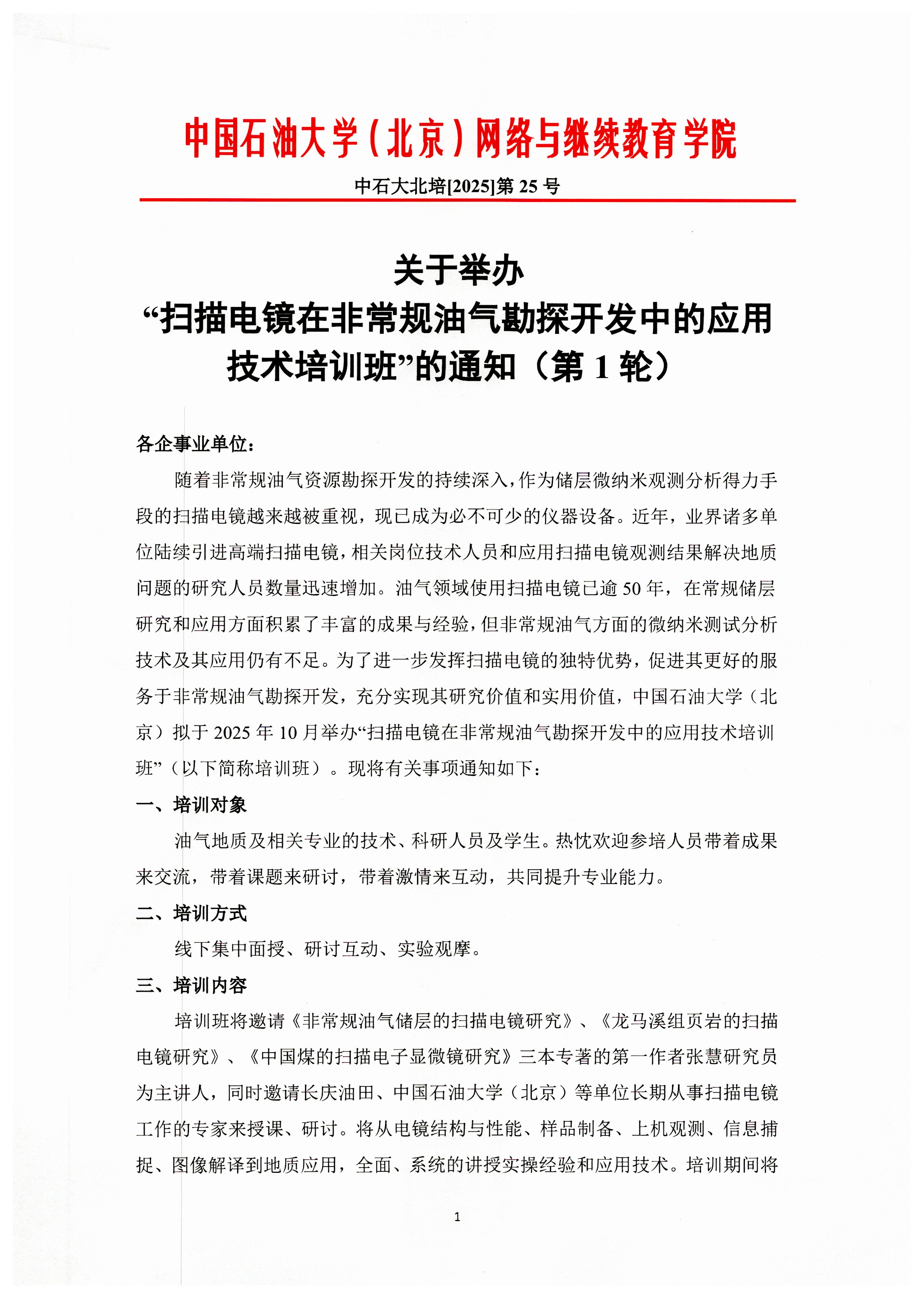 关于举办“扫描电镜在非常规油气勘探开发中的应用技术培训班”的通知(第1轮)