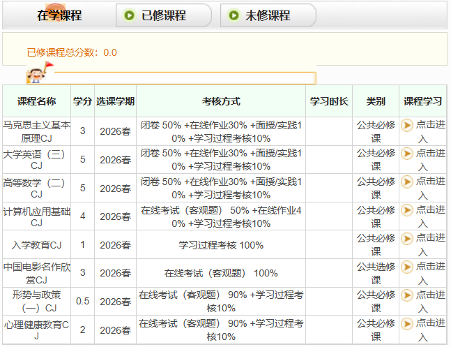 2026级成人教育学生本学期新选的课程共8门,如下表所示: