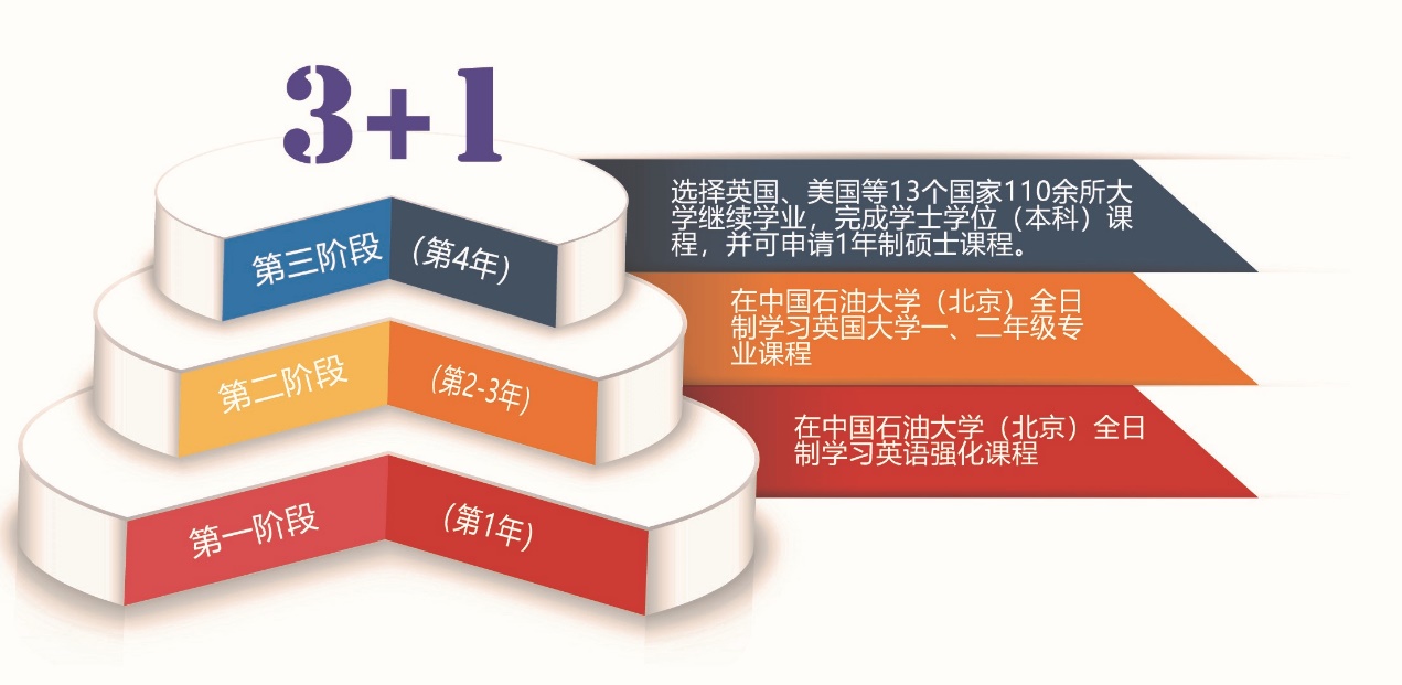 3+1项目为学生提供了国内3年的国际课程,可对接英国、美国、澳大利亚、加拿大、新西兰等13个国家的110余所大学,1年即可完成本科课程,并可连读1年制硕士课程。学生留学归国后,教育部留学服务中心对留学归国学生所获学士、硕士学位给予认证。