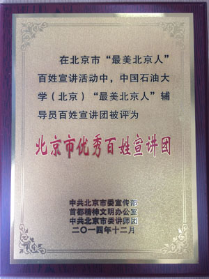 学校辅导员宣讲团作为北京教育系统特色宣讲团先后参加了北京市“最美北京人”宣讲调讲活动和宣讲巡讲活动,宣讲团在宣讲中结合青年学生接受信息的特点,充分利用多媒体、现场配乐等手段,宣讲了石大普通师生的不平凡故事,描绘了石大“最美北京人”的群像,具体而生动地展现了“最美北京人”的缩影,有效促进了宣讲活动入脑入心,得到了北京市百姓宣讲工作综合考评组的一致好评。