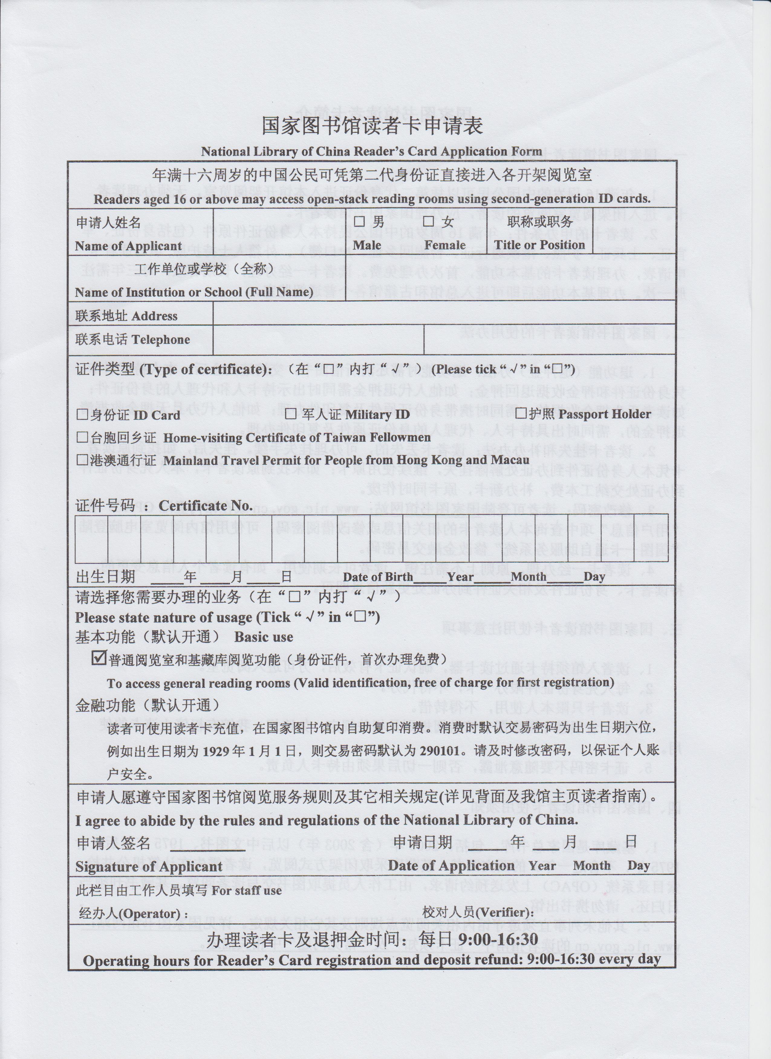 现学校图书馆可代办国家图书馆读者卡,本卡首次办理免费、开通后三年有效,有需要的会员可下载附件中的表格,打印后手填并附上个人身份证复印件(正反面都要)一张,于2013年10月17日(周四)下班前交到人力资源部。