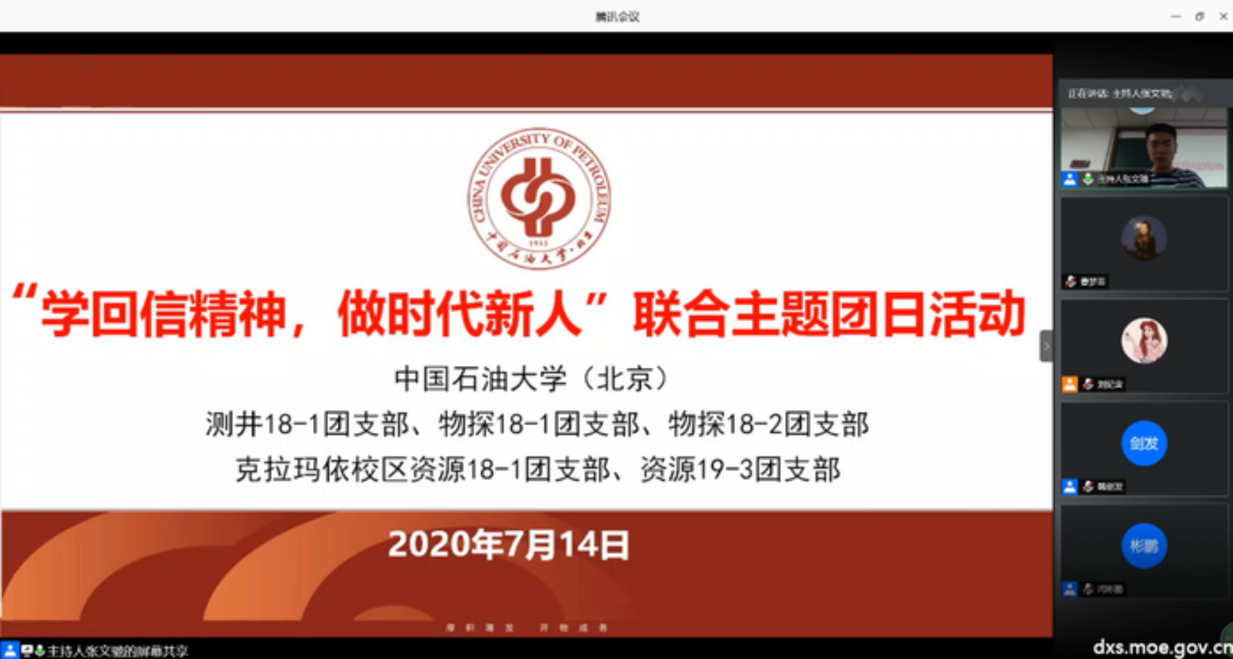 7月7日,习近平总书记给beat365在线唯一官网(北京)克拉玛依校区毕业生回信,在信中肯定了他们到边疆基层工作的选择,对广大高校毕业生提出殷切期望。为深刻学习回信精神,勇做时代新人,7月14日晚21点,beat365在线唯一官网(北京)测井18-1团支部、物探18-1团支部、物探18-2团支部与克拉玛依校区资源18-1团支部、资源19-3团支部联合开展“学回信精神,做时代新人”团日活动,共同学习习近平总书记重要回信精神。